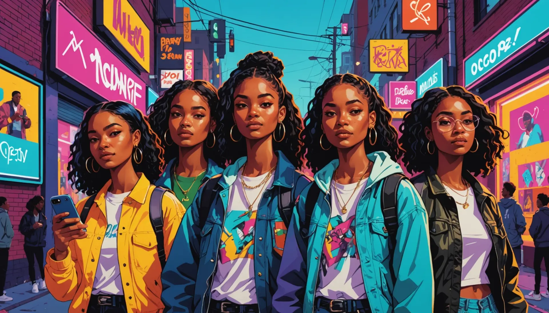 Editorial illustration of a bold street scene captioned vibe representing bomboclatt urban dictionary usage Editorial illustration of a bold street scene captioned vibe representing bomboclatt urban dictionary usage