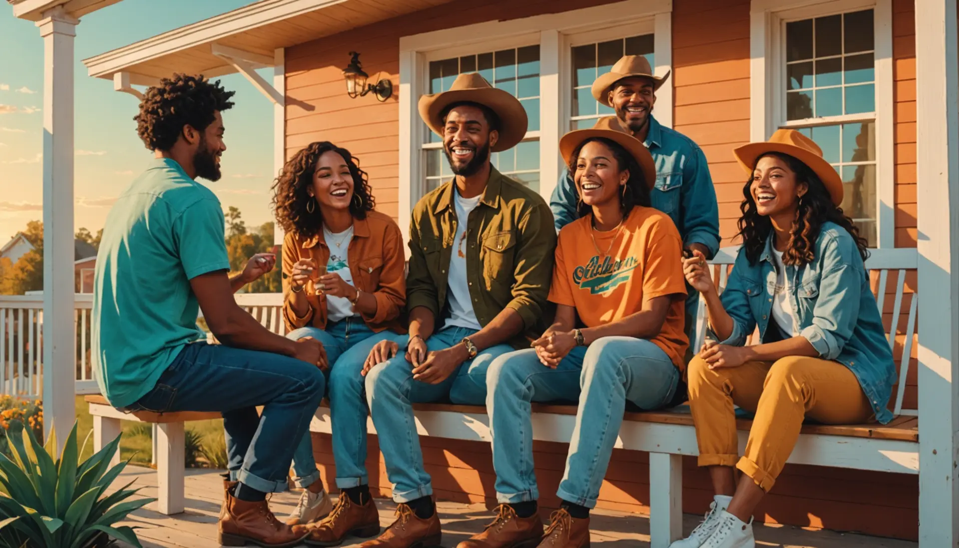 Editorial illustration of friends laughing while one says hoss meaning slang in a casual Southern setting Editorial illustration of friends laughing while one says hoss meaning slang in a casual Southern setting
